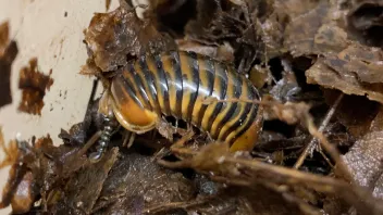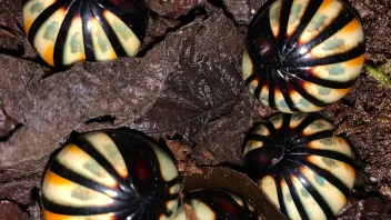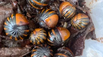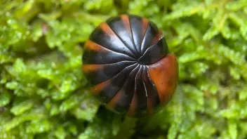 30-45mm große Sphaerotheriida (Zephroniidae, vermutlich Tigridosphaera spec.). Die Segmente tragen einen dünnen, schwarzen Rand auf dem eine orangene Grundfärbung folgt. Das große Analschild ist komplett in dem selben orangenen Farbton gefärbt.